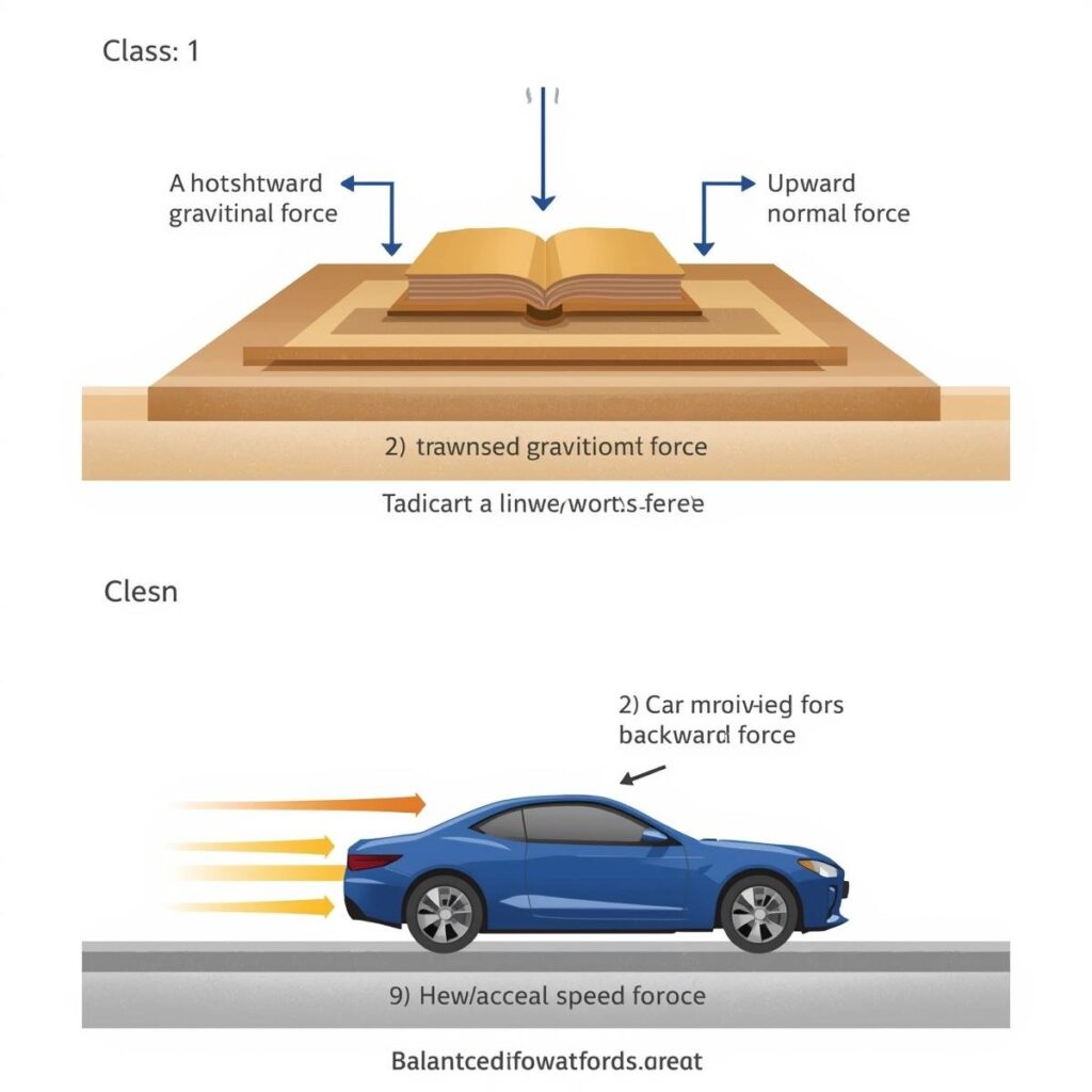 A book resting on a table is in static equilibrium. The gravitational force (weight) acting downward is balanced by the normal reaction force from the table acting upward, so the net force is zero.