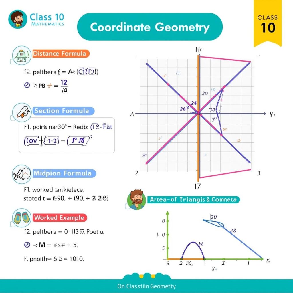 Coordinate Geometry (also called Cartesian Geometry) is the branch of mathematics in which the position of points on a plane is described using ordered pairs called coordinates. The plane is divided by two perpendicular lines: the x-axis (horizontal) and the y-axis (vertical), which intersect at the origin (0, 0).