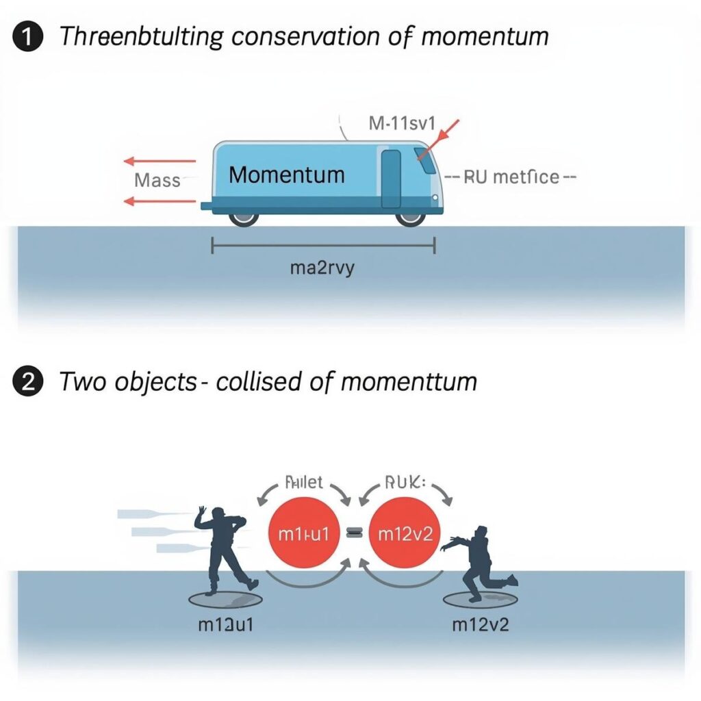 Conservation of Momentum | Total momentum remains constant in absence of external force | m₁u₁ + m₂u₂ = m₁v₁ + m₂v₂ | Two skaters pushing off |